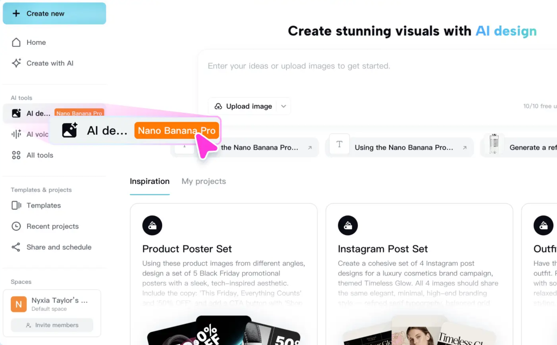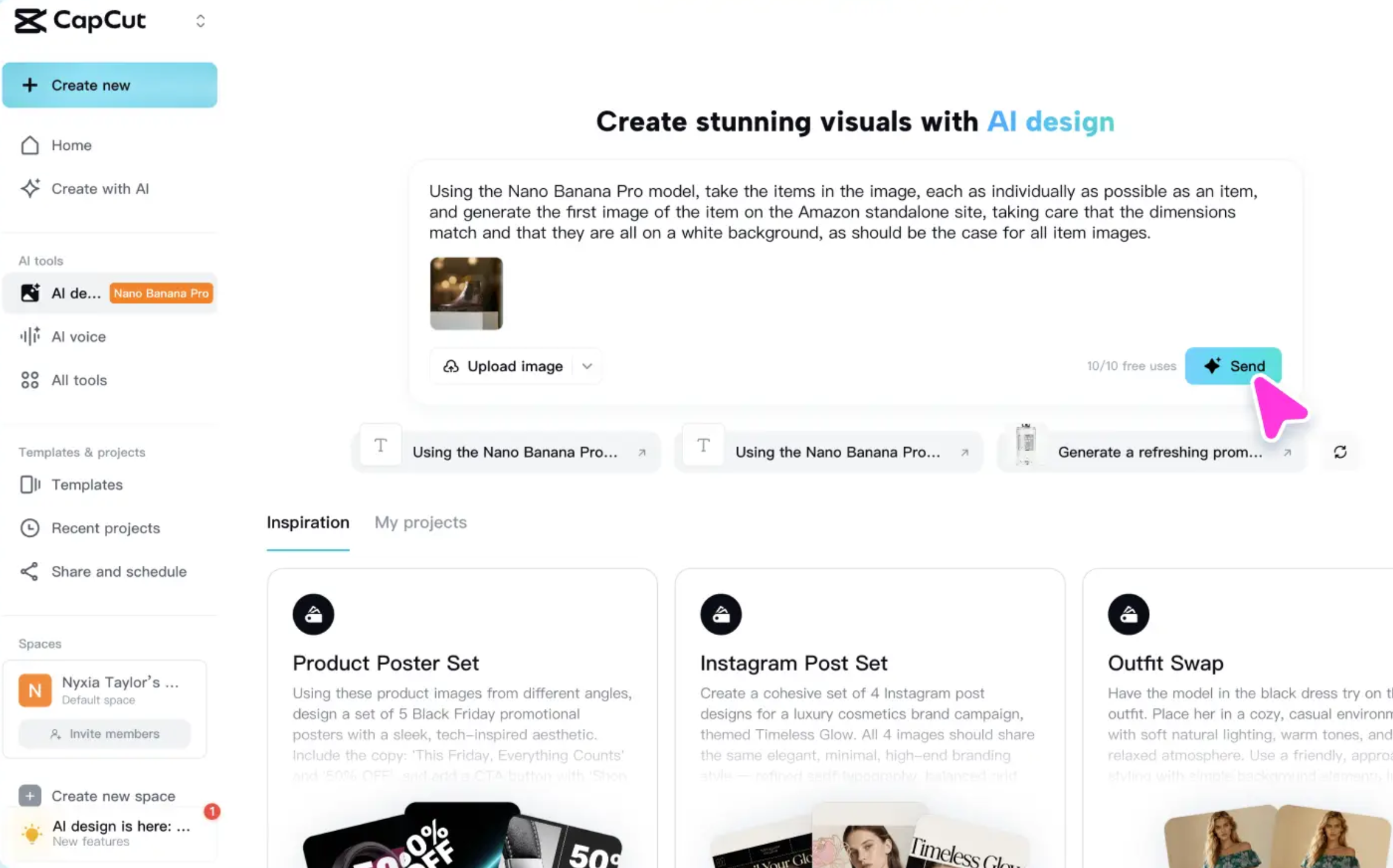 Click the button on the Nano Banana Pro page to open CapCut’s AI Design tool online. This workspace is where you will generate clean product visuals, backgrounds, and image variations for your video. You don’t need any technical experience to get started. Everything is laid out clearly: a prompt box, a reference image upload option, and a real-time preview window. This tool lets you quickly turn an ordinary product photo into: