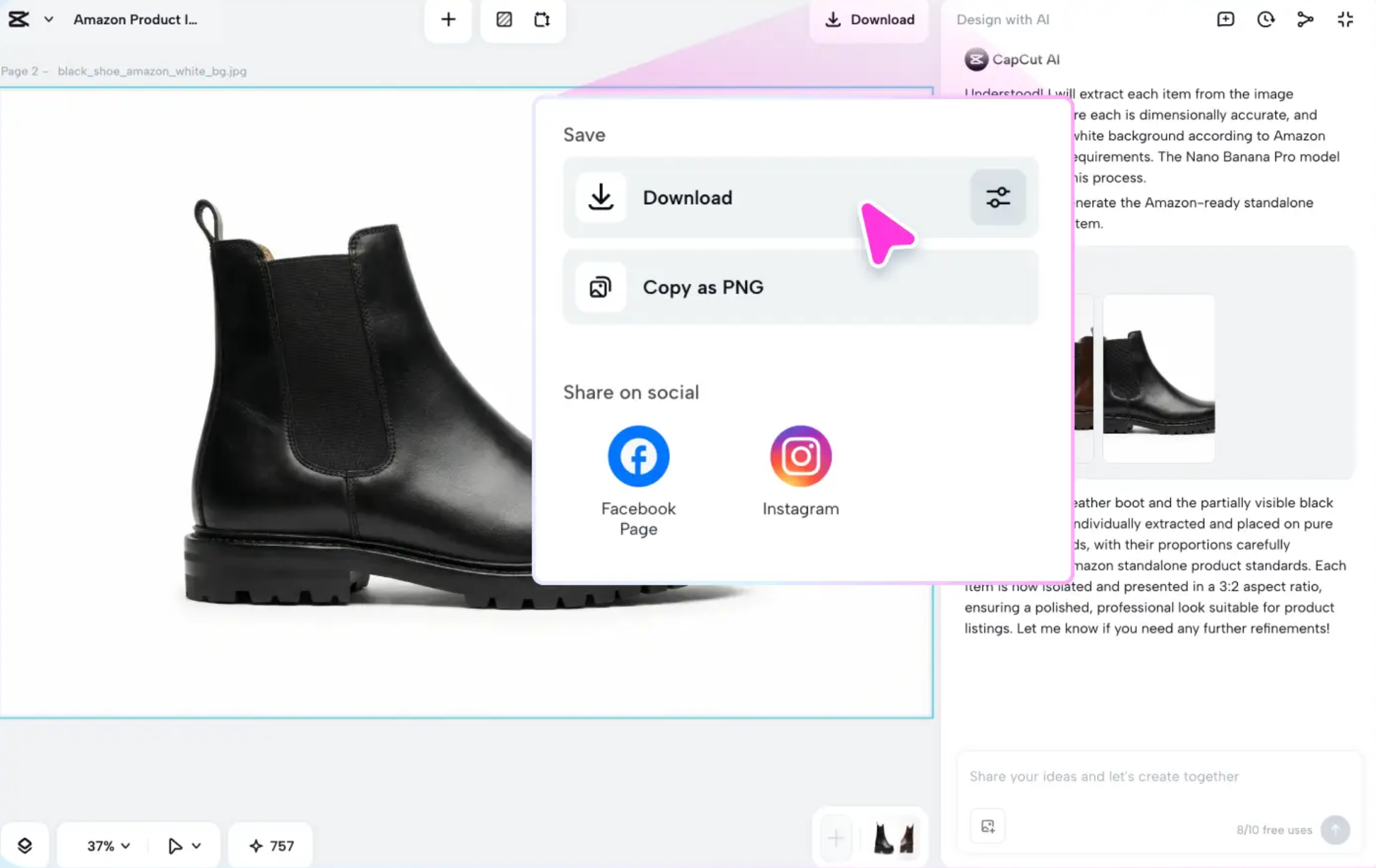 When satisfied, click “Download” to save your final image in high quality. You can now use these visuals to create your product video. If you want different angles, repeat the prompt with variations.