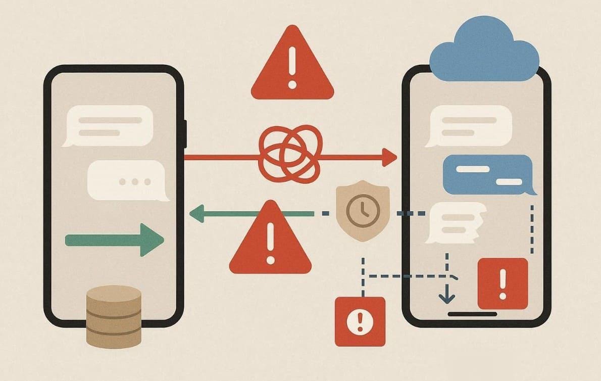1. Method Conflict: Every method follows specific data rules that prevent smooth switching. When combined, they corrupt message states, confusing WhatsApp’s restore function.